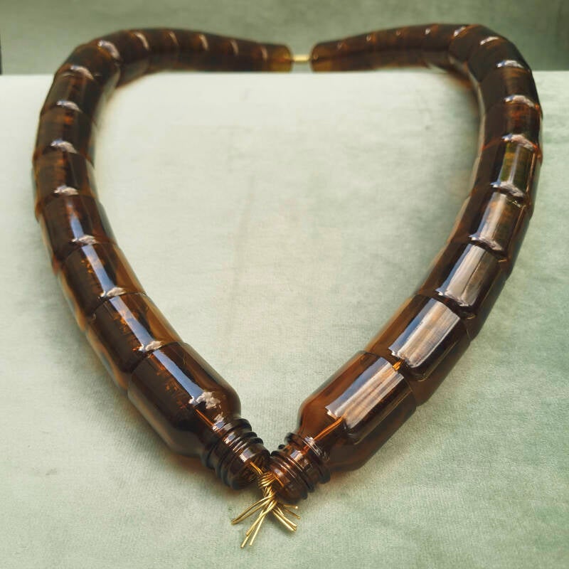In April 2018, we welcomed our second FIV cat. Since then, we have been administering Interferon to him twice a day. To date, we have used 28 bottles of Interferon. From these bottles, I created a necklace to raise awareness about the impact of cuts to foreign aid. Being unhealthy is fundamentally a misfortune, and when medication is available, it should be accessible to all. The social ramifications of HIV and the deaths resulting from AIDS are so significant that we must not allow this to happen.