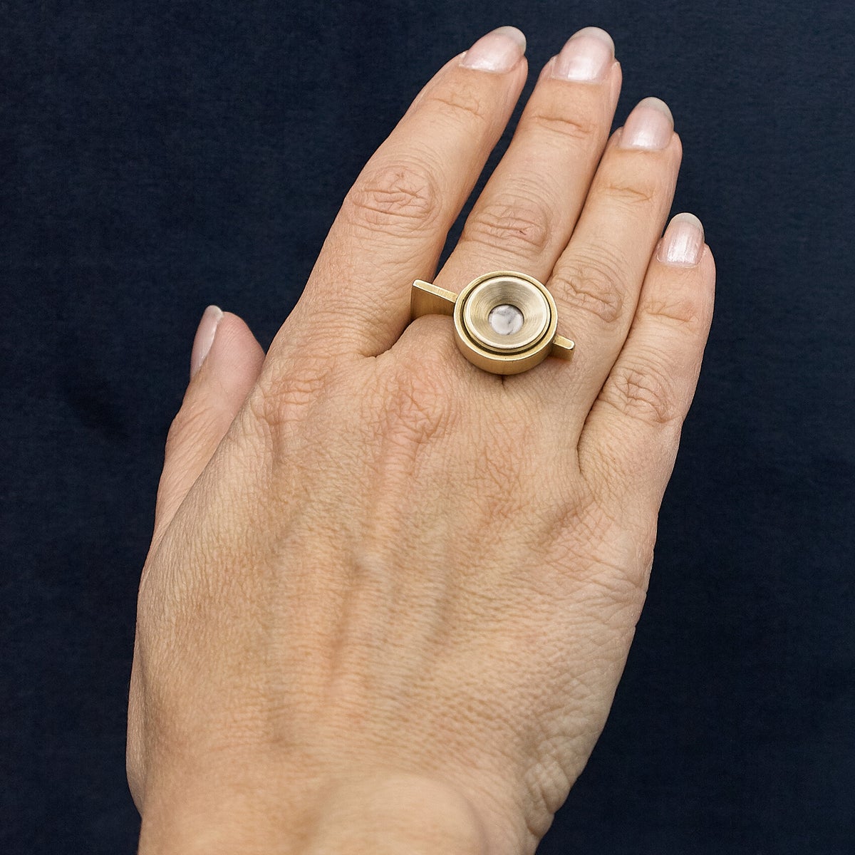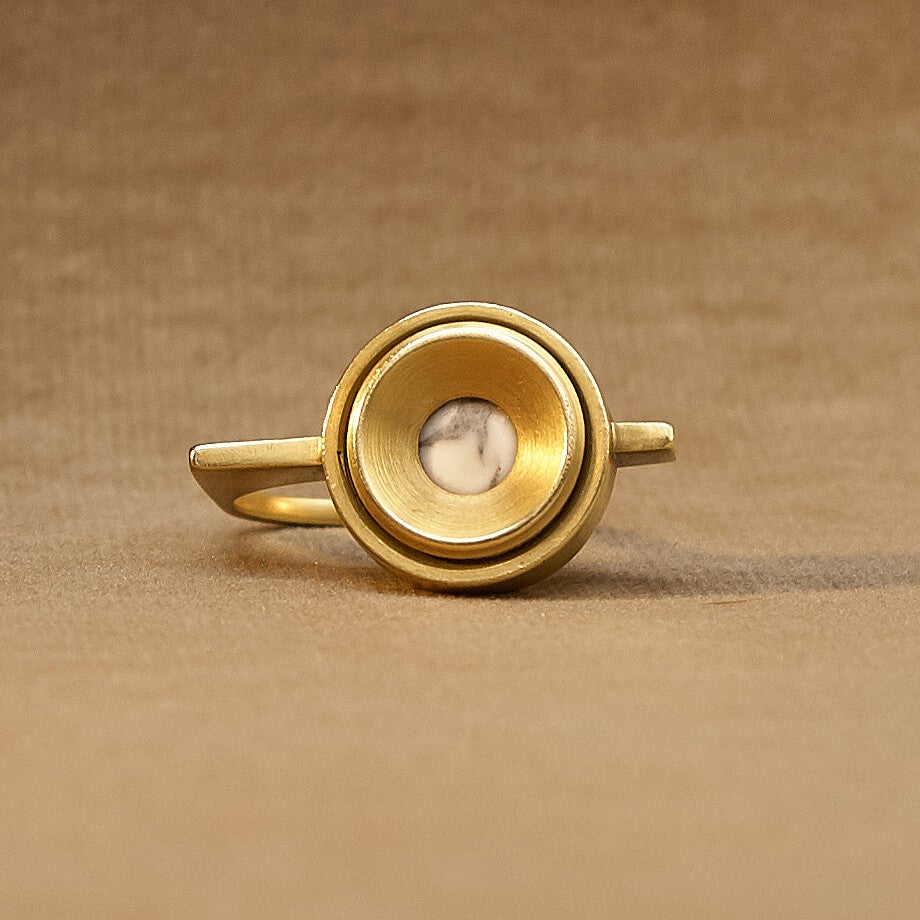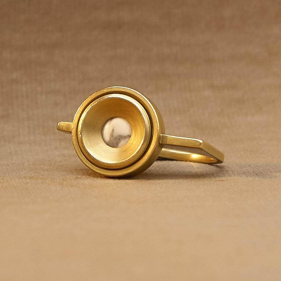 Het is gemaakt van het bevestigingsmateriaal om een schroef te bedekken waarmee een spiegel wordt opgehangen. De cabochon van howliet wordt geklemd tussen de beide delen van deze afdek dop.